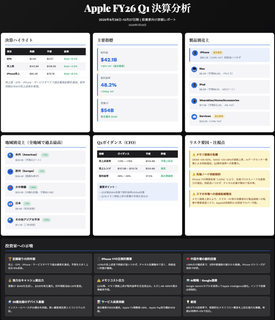 📝 キーポイント: iPhone 17シリーズが牽引し、売上・EPS・CFともに過去最高。中国市場が劇的V字回復。GoogleとのAI提携を発表。供給制約は「先端ノード」に起因し、メモリ価格上昇リスクはあるものの粗利益率は48-49%と高水準を維持見込み。