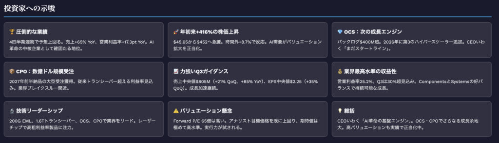 概要: クラウド向け光トランシーバーと光回線スイッチ(OCS)が爆発的に成長し、売上高は過去最高を更新。AI需要が供給を30%上回る状況が続いており、日本・英国工場での増産を前倒しで進めています。次期Q3の売上見通しも$805M(中間値)と大幅な増収を予測。
