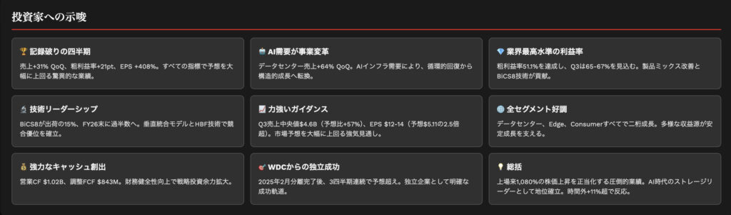 📝 キーポイント: AI需要と価格上昇により、ガイダンスを大幅に上回る好決算。粗利益率は前四半期の29.9%から51.1%へ急騰。次期Q3粗利益率予想は65-67%。京セラとのJVを2034年まで延長。データセンター向けエンタープライズSSDが爆発的成長。